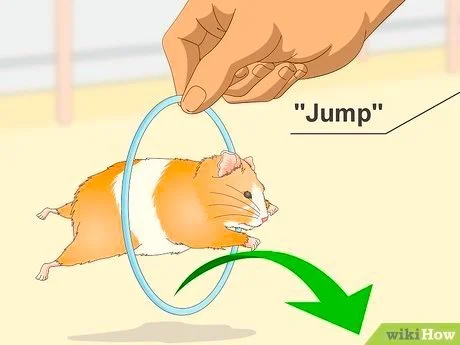 Another fun trick you can teach your hamster is to jump through a hoop. Hold a small plastic hoop in front of them with one hand and a treat on the other side with another. Say, “jump” every time you get them to jump through the hoop and they will soon learn to do it on command.